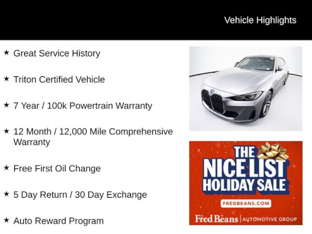 2023 BMW 4 Series 430i Gran Coupe 430i Gran Coupe 2.0L 4-Cylinder DOHC 16V Turbocharged 8-Speed Automatic Sport AWD 4D Hatchback Skyscraper Gray Metallic Great Service History, Triton Certified Vehicle, 7 Year / 100k Powertrain Warranty, 12 Month / 12,000 Mile Comprehensive Warranty, Free First Oil Change, 5 Day Return / 30 Day Exchange, Auto Reward Program.