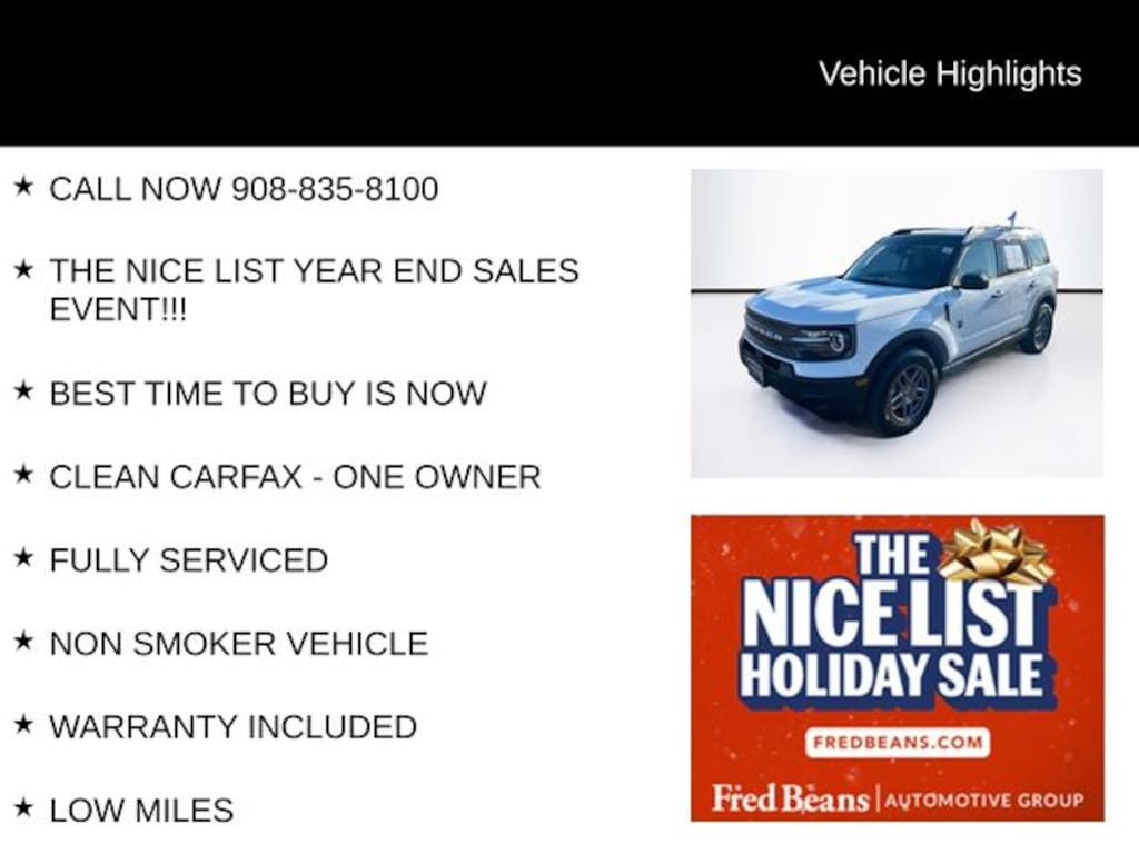 Don't miss this opportunity to make the 2025 Ford Bronco Sport Big Bend your own. Call us now at 908-835-8100 to schedule a test drive and experience the perfect blend of capability, comfort, and convenience. The time to buy is now, during our Nice List Year-End Sales Event!