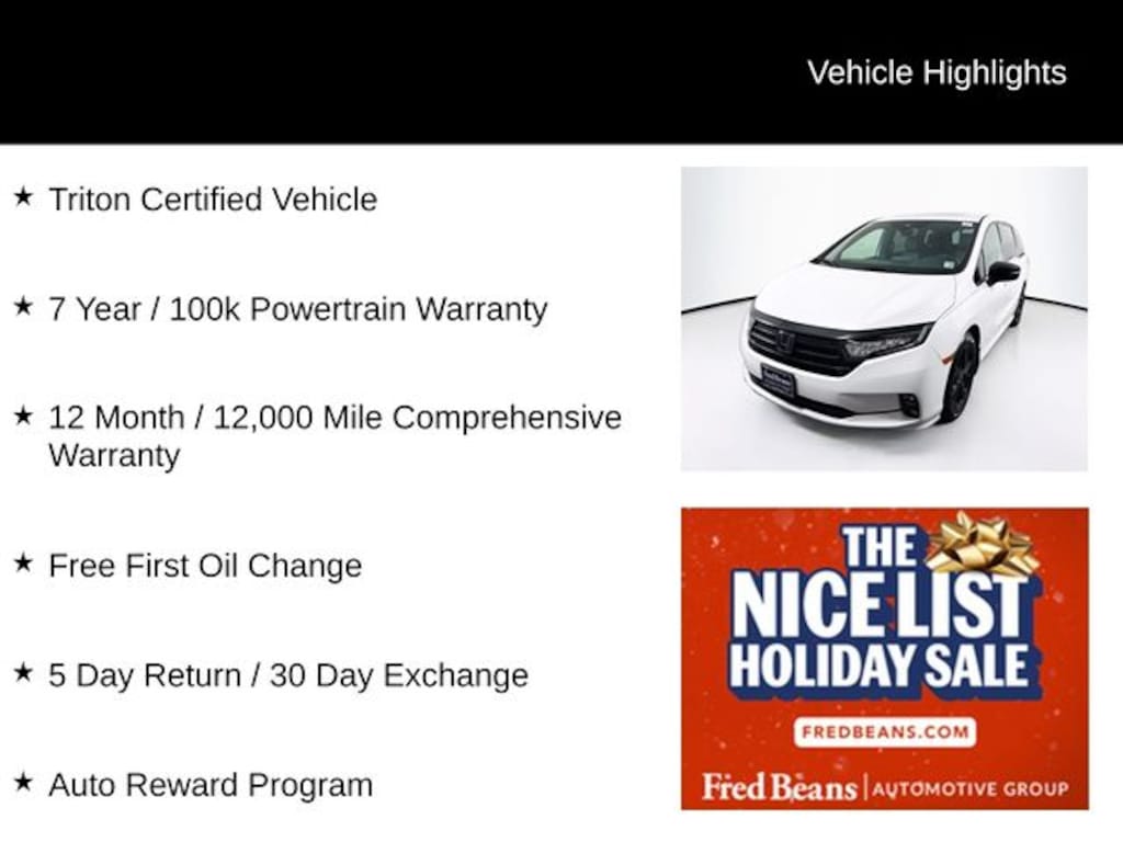 2023 Honda Odyssey Sport Sport 3.5L V6 SOHC i-VTEC 24V 10-Speed Automatic FWD 4D Passenger Van Platinum White Pearl Triton Certified Vehicle, 7 Year / 100k Powertrain Warranty, 12 Month / 12,000 Mile Comprehensive Warranty, Free First Oil Change, 5 Day Return / 30 Day Exchange, Auto Reward Program.
