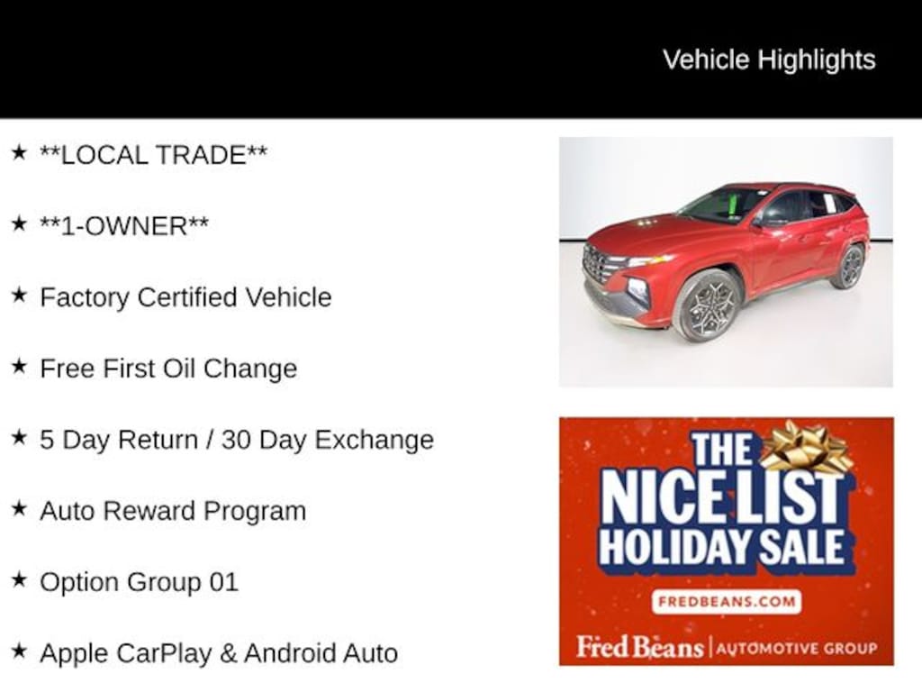 **LOCAL TRADE**, **1-OWNER**, Factory Certified Vehicle, Free First Oil Change, 5 Day Return / 30 Day Exchange, Auto Reward Program, Apple CarPlay & Android Auto, Option Group 01, 3.648 Axle Ratio, 4-Wheel Disc Brakes, 8 Speakers, ABS brakes, Air Conditioning, Alloy wheels, AM/FM radio: SiriusXM, Auto High-beam Headlights, Auto-dimming Rear-View mirror, Automatic temperature control, Brake assist, Bumpers: body-color, Cargo Cover, Cargo Net, Cargo Tray, Carpeted Floor Mats, Delay-off headlights, Driver door bin, Driver vanity mirror, Dual front impact airbags, Dual front side impact airbags, Electronic Stability Control, Emergency communication system: Blue Link Connected Car Service (3-year complimentary subscription), First Aid Kit, Four wheel independent suspension, Front anti-roll bar, Front Bucket Seats, Front Center Armrest, Front dual zone A/C, Front reading lights, Fully automatic headlights, Garage door transmitter: HomeLink, Heated door mirrors, Heated Front Bucket Seats, Heated front seats, Illuminated entry, Low tire pressure warning, Occupant sensing airbag, Outside temperature display, Overhead airbag, Overhead console, Panic alarm, Passenger door bin, Passenger vanity mirror, Power door mirrors, Power driver seat, Power Liftgate, Power steering, Power windows, Radio data system, Radio: Bose Premium w/AM/FM/HD/SiriusXM Audio System, Rear anti-roll bar, Rear seat center armrest, Rear window defroster, Rear window wiper, Remote keyless entry, Roof rack: rails only, Security system, Speed control, Split folding rear seat, Spoiler, Sport Combination Seat Trim, Steering wheel mounted audio controls, Tachometer, Telescoping steering wheel, Tilt steering wheel, Traction control, Trip computer, Turn signal indicator mirrors, Variably intermittent wipers, Wheels: N Line 19" x 7.5J" Alloy, Apple CarPlay & Android Auto, Option Group 01.