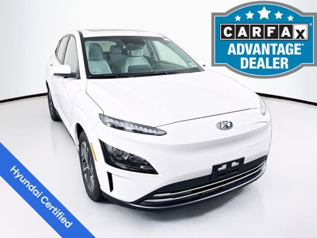 2023 Hyundai Kona Electric SEL Electric Motor 1-Speed Automatic FWD 4D Sport Utility Lunar White Factory Certified Vehicle, Free First Oil Change, 5 Day Return / 30 Day Exchange, Auto Reward Program, AM/FM radio: SiriusXM, Apple CarPlay & Android Auto, Automatic temperature control, Fully automatic headlights, Heated door mirrors, Heated Front Bucket Seats, Heated front seats, Navigation System, Power door mirrors, Power driver seat, Power moonroof, Remote keyless entry, Steering wheel mounted audio controls.