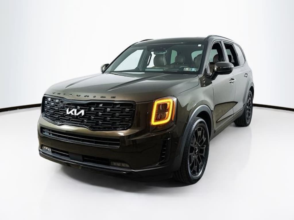 2022 Kia Telluride SX 3.8L V6 DOHC 8-Speed Automatic AWD 4D Sport Utility Dark Moss Kia Certified Pre-Owned Certified, 10 Speakers, 110V Inverter, 3.648 Axle Ratio, 3rd row seats: split-bench, 4-Wheel Disc Brakes, ABS brakes, Air Conditioning, Alloy wheels, AM/FM radio: SiriusXM, Apple CarPlay & Android Auto, Auto High-beam Headlights, Auto-dimming Rear-View mirror, Automatic temperature control, Black Finish Radiator Grille, Body Color Exterior Door Handles, Brake assist, Bumpers: body-color, Cargo Cover, Cargo Seatback Up Mat, Carpeted Floor Mats, Compass, Delay-off headlights, Driver door bin, Driver vanity mirror, Dual front impact airbags, Dual front side impact airbags, Electronic Stability Control, Emergency communication system: 911 Connect, Exclusive Black Fog Light Bezel, Exclusive Black Headlight Bezels, Four wheel independent suspension, Front & Rear Gloss Black Finish Bumper Skid Plates, Front anti-roll bar, Front Bucket Seats, Front Center Armrest, Front dual zone A/C, Front fog lights, Front reading lights, Fully automatic headlights, Garage door transmitter: HomeLink, Gloss Black Finish Exterior Emblems, Gloss Black Finish Front & Rear Door Garnish, Gloss Black Finish Roof Rails, harman/kardon® Speakers, Heads-Up Display, Heated & Ventilated 2nd Row Seats, Heated & Ventilated Front Bucket Seats, Heated door mirrors, Heated front seats, Heated steering wheel, Hybrid Cargo Net, Illuminated entry, Knee airbag, Leather Seat Trim, Leather Shift Knob, Leather steering wheel, Low tire pressure warning, Memory seat, Navigation System, Nightfall Edition Package, Occupant sensing airbag, Outside temperature display, Overhead airbag, Overhead console, Panic alarm, Passenger door bin, Passenger vanity mirror, Power door mirrors, Power driver seat, Power Liftgate, Power moonroof, Power passenger seat, Power steering, Power windows, Premium Cloth Headliner & Pillar Trim, Premium Nappa Leather Seat Trim, Radio data system, Radio: AM/FM harman/kardon Audio System, Rain-Sensing Front Windshield Wipers, Rear air conditioning, Rear anti-roll bar, Rear audio controls, Rear reading lights, Rear window defroster, Rear window wiper, Reclining 3rd row seat, Remote keyless entry, Roof rack: rails only, Security system, Self Leveling Rear Suspension, Smart Key w/ Push Button and Remote Start, Speed control, Speed-sensing steering, Split folding rear seat, Spoiler, Steering wheel mounted audio controls, SX Dune Brown Nappa Leather Seats, SX Prestige Package, Tachometer, Telescoping steering wheel, Tilt steering wheel, Tow Hitch w/Harness (TOF), Towing Package, Traction control, Trip computer, Turn signal indicator mirrors, Variably intermittent wipers, Ventilated front seats, Wheels: 20" x 7.5" Black Alloy, Wheels: 20" x 7.5" Exclusive Black Alloy.
