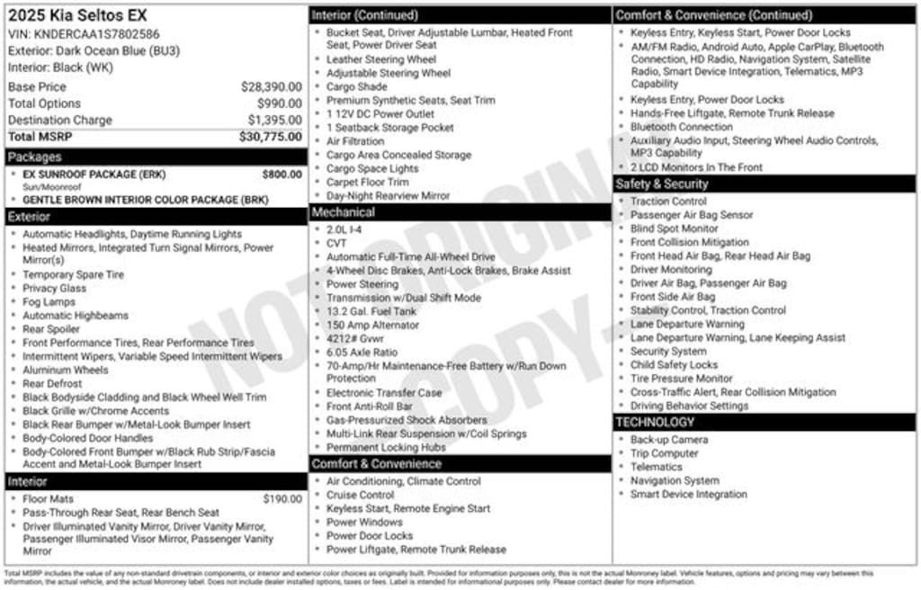 Recent Arrival! 2025 Kia Seltos EX 2.0L I4 MPI CVT AWD 4D Sport Utility Dark Ocean Blue Kia Certified Pre-Owned Certified, 4-Wheel Disc Brakes, 6 Speakers, ABS brakes, Air Conditioning, Alloy wheels, AM/FM radio: SiriusXM, Apple CarPlay & Android Auto, Artificial Leather Seat Trim, Auto High-beam Headlights, Automatic temperature control, Brake assist, Bumpers: body-color, Carpet Floor Mats, Delay-off headlights, Driver door bin, Driver vanity mirror, Dual front impact airbags, Dual front side impact airbags, Electronic Stability Control, Emergency communication system: 911 Connect, EX Sunroof Package, Exterior Parking Camera Rear, Four wheel independent suspension, Front anti-roll bar, Front Bucket Seats, Front Center Armrest, Front fog lights, Front reading lights, Fully automatic headlights, Gentle Brown Interior Color Package, Heated door mirrors, Heated Front Bucket Seats (3-Steps), Heated front seats, Illuminated entry, Leather Shift Knob, Leather steering wheel, Low tire pressure warning, Navigation System, Occupant sensing airbag, Outside temperature display, Overhead airbag, Overhead console, Panic alarm, Passenger door bin, Passenger vanity mirror, Power door mirrors, Power driver seat, Power Liftgate, Power steering, Power Sunroof, Power windows, Radio: AM/FM/HD/Satellite Display System w/Navigation, Rear seat center armrest, Rear window defroster, Rear window wiper, Remote keyless entry, Security system, Speed control, Speed-sensing steering, Split folding rear seat, Spoiler, Steering wheel mounted audio controls, Tachometer, Telescoping steering wheel, Tilt steering wheel, Traction control, Trip computer, Turn signal indicator mirrors, Variably intermittent wipers, Wheels: 17" Alloy w/Machined Finished.