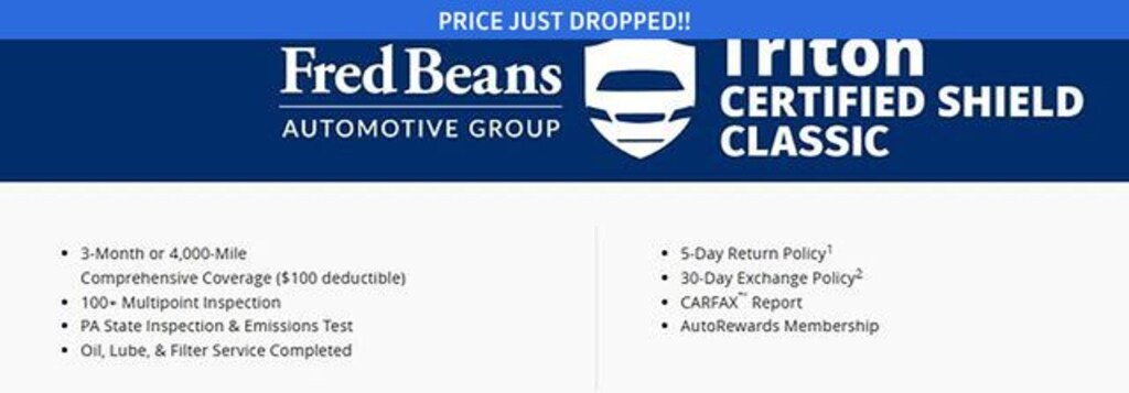 For better peace of mind all our used vehicles have a 127-point inspection and come with a 5-day return, 30-day exchange (As-Is vehicles are excluded). Our exclusive Auto Rewards Program provides better value with $50 Service Gift Certificate, Free Pa State Safety inspections, discounts for local merchants and more. Plus, you can earn up to $2000 towards your next vehicle just by servicing with Fred Beans! As Fred Beans always says, our used cars are better because our reputation depends on it.