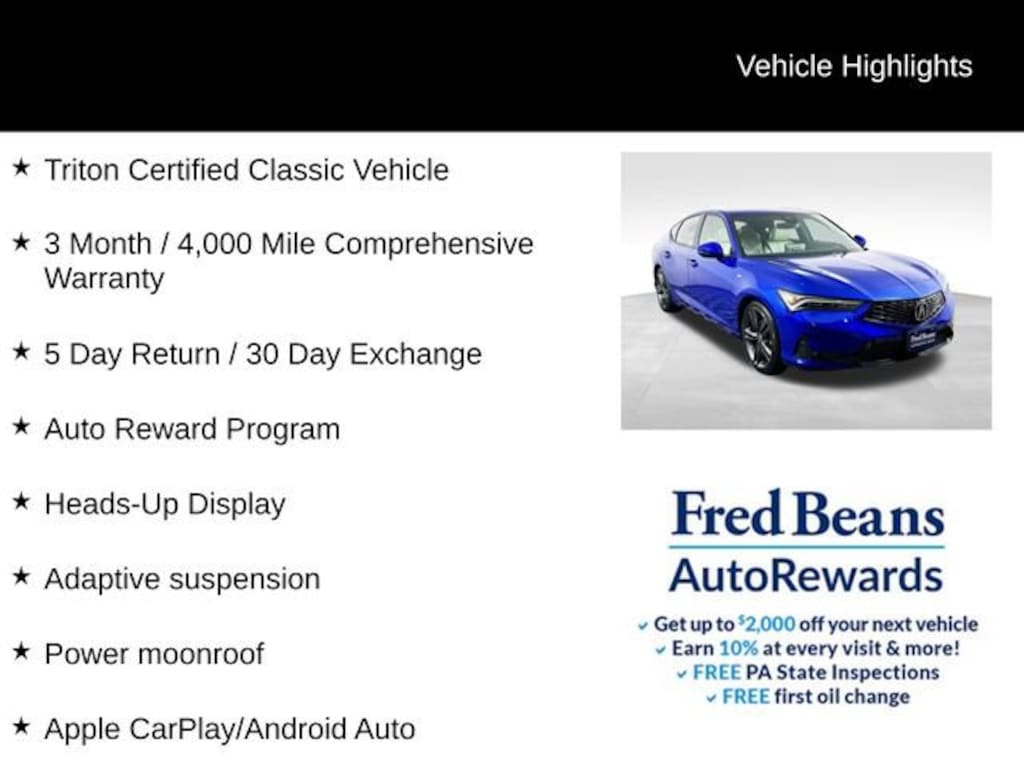 Elevate your driving experience with the exceptional 2023 Acura Integra A-Spec Tech Package. This captivating sedan seamlessly blends style, performance, and cutting-edge technology, making it the perfect choice for the discerning driver.Indulge in a host of premium features, including - a Heads-Up Display, Adaptive Suspension, Power Moonroof, and seamless integration of Apple CarPlay and Android Auto. Additionally, you'll enjoy the convenience of - 16 Speakers, Automatic Climate Control, Keyless Entry, and Steering Wheel-Mounted Audio Controls.- Triton Certified Classic Vehicle- 3 Month / 4,000 Mile Comprehensive Warranty- 5 Day Return / 30 Day Exchange- Auto Reward ProgramBeneath the sleek exterior, this Integra is powered by a dynamic 1.5L I4 DOHC 16V engine, paired with a 6-Speed Manual transmission, delivering an exceptional driving experience. With an EPA-estimated 26 MPG in the city and 36 MPG on the highway, you'll enjoy the perfect balance of performance and efficiency.As a Triton Certified Classic Vehicle, this 2023 Acura Integra has undergone a rigorous inspection and reconditioning process, ensuring it meets the highest standards of quality and reliability. You can drive with confidence, knowing that this vehicle has been meticulously cared for and is backed by a comprehensive warranty.Elevate your driving experience and make a statement with the 2023 Acura Integra A-Spec Tech Package. This exceptional sedan offers a captivating blend of style, performance, and cutting-edge technology, making it the perfect choice for the discerning driver. Visit our showroom today and discover the true joy of driving.