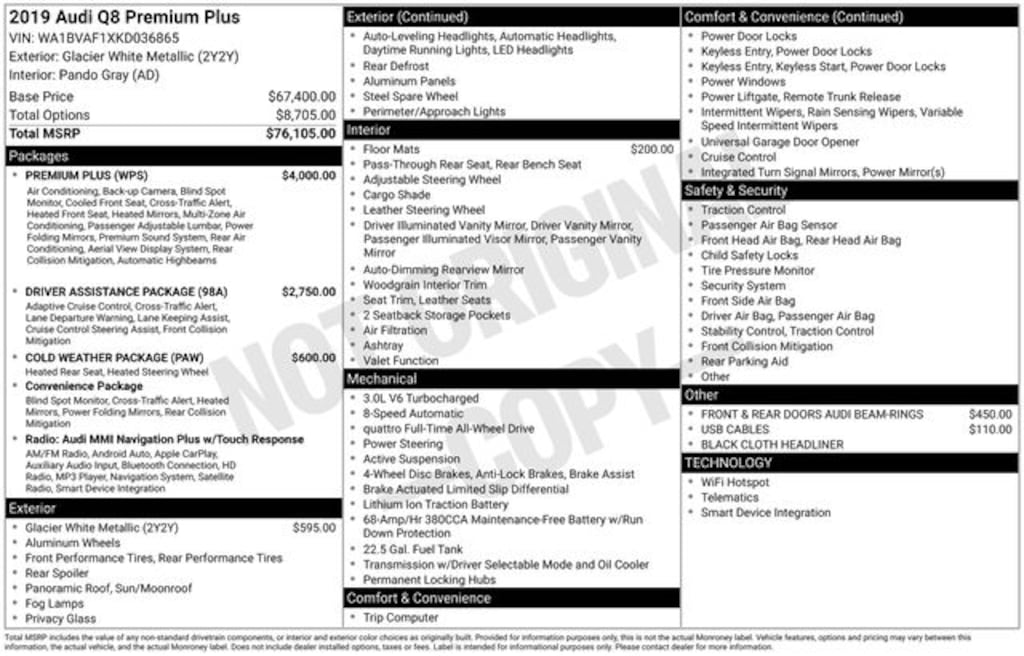 I truly cannot say enough positive things about the Q8! I love the sporty and sleek exterior as well as The very techy interior. The car is very comfortable to sit in in the car drive super smooth. I’m really surprised how sporty and peppythe car is when you want it to be. When I bought the car I was also considering the Porsche Cayenne in the land rover Velar. As far as the exterior looks go, I’m really surprised at just how much the wheel dictates the look of this car. I chose the year one wheel and couldn’t be happier !!… - 5.0