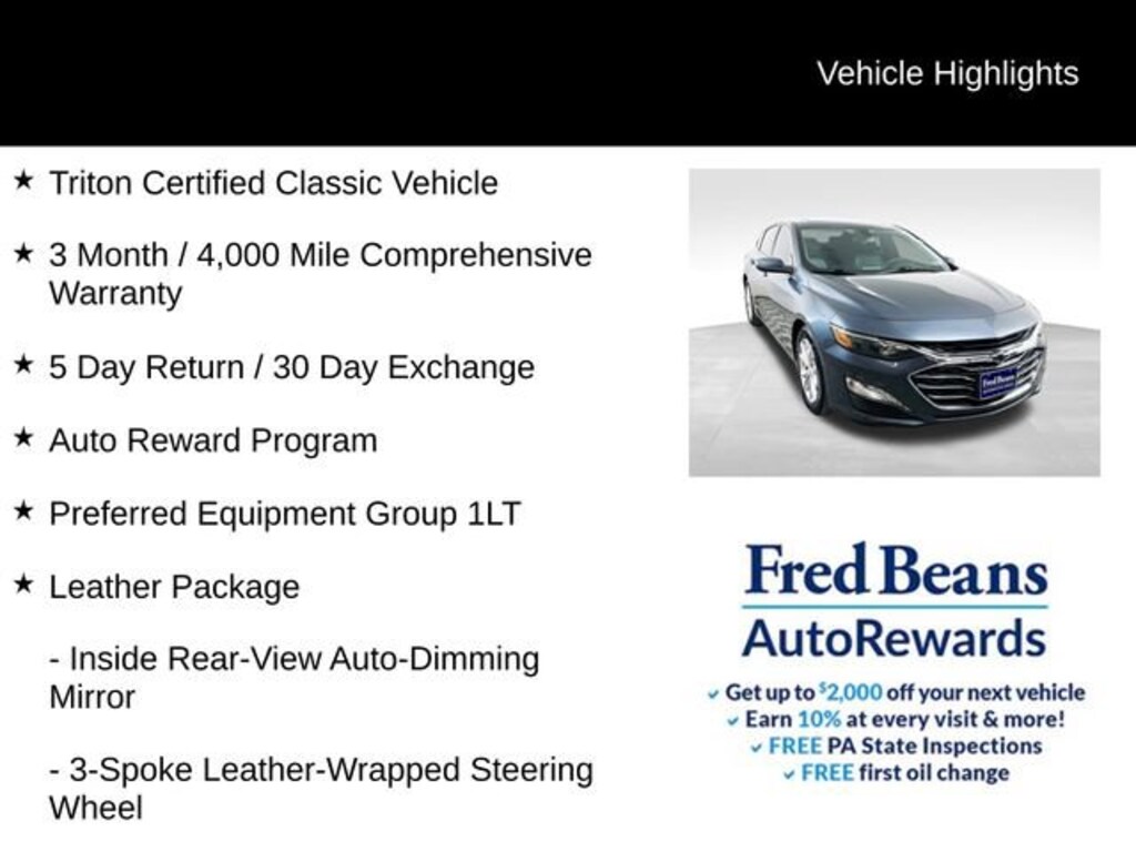 Powered by a 1.5L DOHC engine and equipped with a CVT transmission, this Malibu delivers an impressive 29 MPG in the city and 36 MPG on the highway, making it an exceptional choice for both city commutes and long-distance travels. The Triton Certified Classic Vehicle designation ensures that this Malibu has been meticulously inspected and comes with a comprehensive warranty, giving you the peace of mind you deserve.