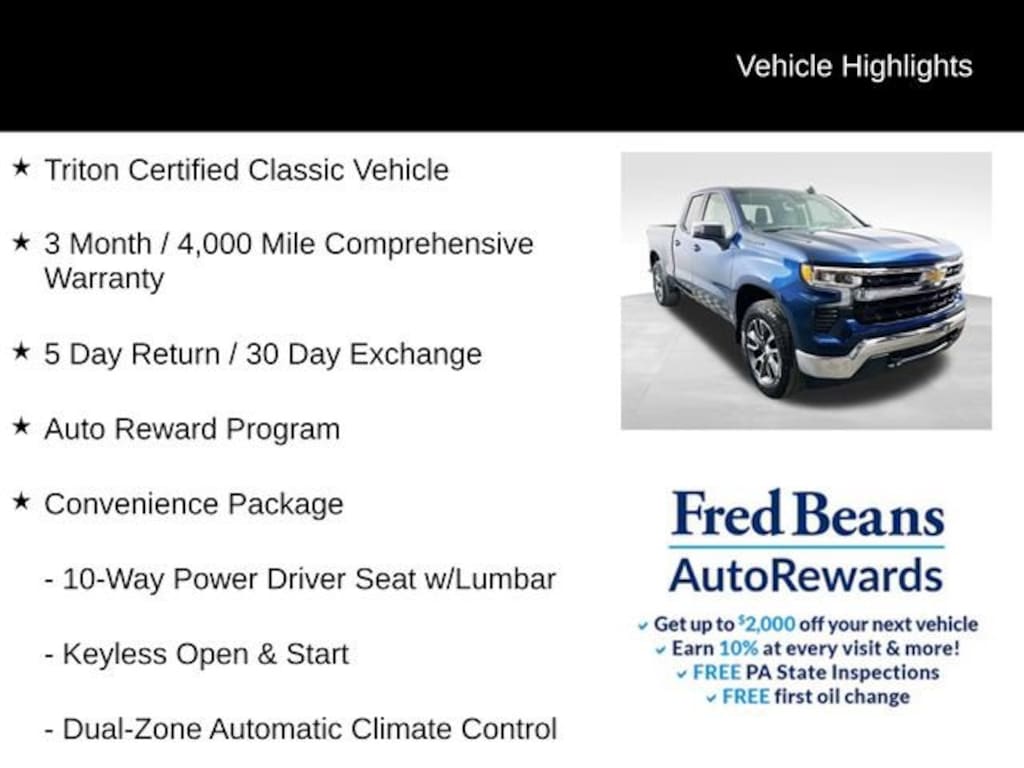This Silverado LT is a Triton Certified Classic Vehicle, meaning it has undergone a rigorous inspection and comes with a comprehensive 3-month/4,000-mile warranty. You can purchase with confidence, knowing that this truck has been meticulously maintained and is ready to provide years of reliable service.