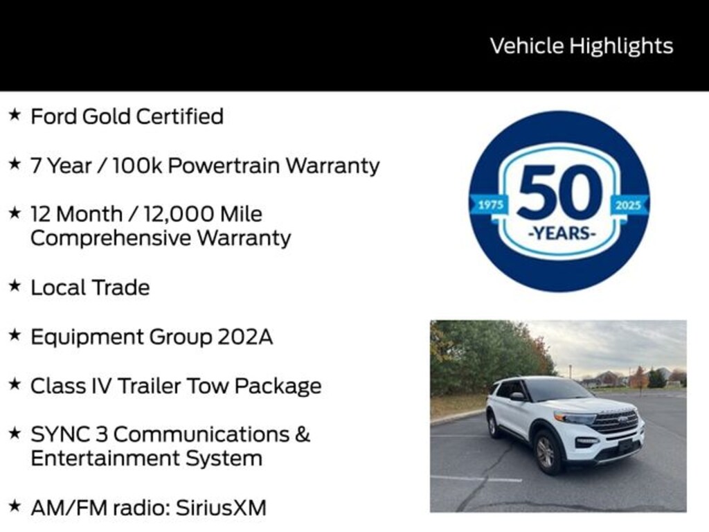 Recent Arrival! 2022 Ford Explorer XLT 2.3L EcoBoost I-4 10-Speed Automatic 4WD 4D Sport Utility Star White Metallic Tri-Coat Ford Gold Certified, 7 Year / 100k Powertrain Warranty, 12 Month / 12,000 Mile Comprehensive Warranty, Local Trade, 3rd row seats: bench, Acoustic-Laminated Front Side Windows, ActiveX Captain's Chairs, AM/FM radio: SiriusXM, Automatic temperature control, Class IV Trailer Tow Package, Equipment Group 202A, Exterior Parking Camera Rear, Front Center Armrest, Front dual zone A/C, Heated door mirrors, Heated front seats, Heated Steering Wheel, LED Fog Lamps, Power door mirrors, Power driver seat, Power Liftgate, Power passenger seat, Power windows, Rear air conditioning, Rear window defroster, Rear window wiper, Remote keyless entry, Remote Start System, SecuriCode Keyless Entry Keypad, Speed control, SYNC 3 Communications & Entertainment System, SYNC 3/Apple CarPlay/Android Auto, Tilt steering wheel, Wheels: 18" 5-Spoke Silver-Painted Aluminum. 20/27 City/Highway MPG