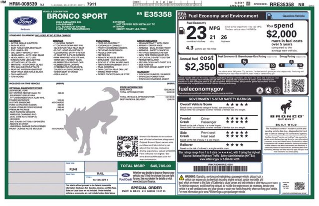 Conquer any terrain with confidence, thanks to the Bronco Sport Badlands' impressive off-road capabilities. The Intelligent Adaptive Cruise Control with Stop & Go, Lane Centering, and Speed Sign Recognition ensures a smooth and effortless ride, while the Evasive Steering Assist and Rear Parking Sensors provide added peace of mind.