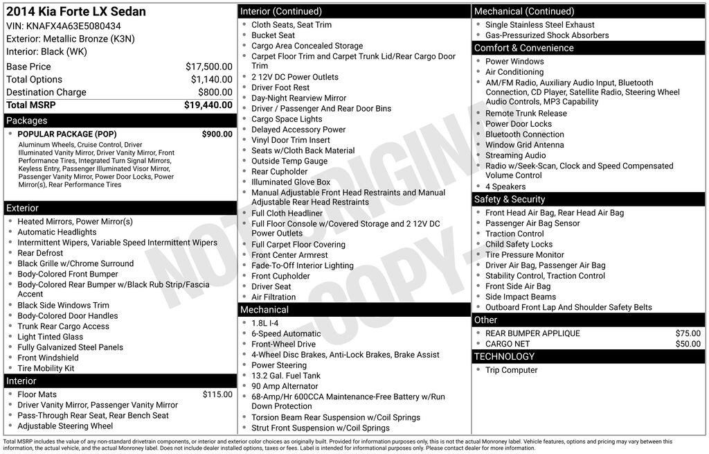 The Forte LX is equipped with a host of features that cater to your driving needs and enhance your overall experience. Enjoy the convenience of the AM/FM/CD/MP3 audio system, the comfort of the rear window defroster, and the peace of mind provided by the electronic stability control and traction control systems.
